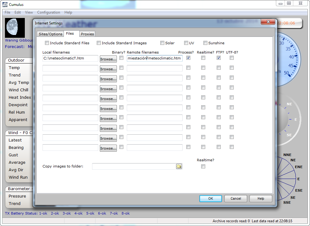 En la columna «Local filenames» tenemos que poner la dirección donde tenemos guardada La Plantilla que hemos descargado de Meteoclimatic. Como normalmente la tendremos en «C», la dirección que debiéramos poner ahí sería «C:\MeteoclimaticT.htm». Si la hemos guardado en cualquier otro sitio, pondremos la dirección correcta.