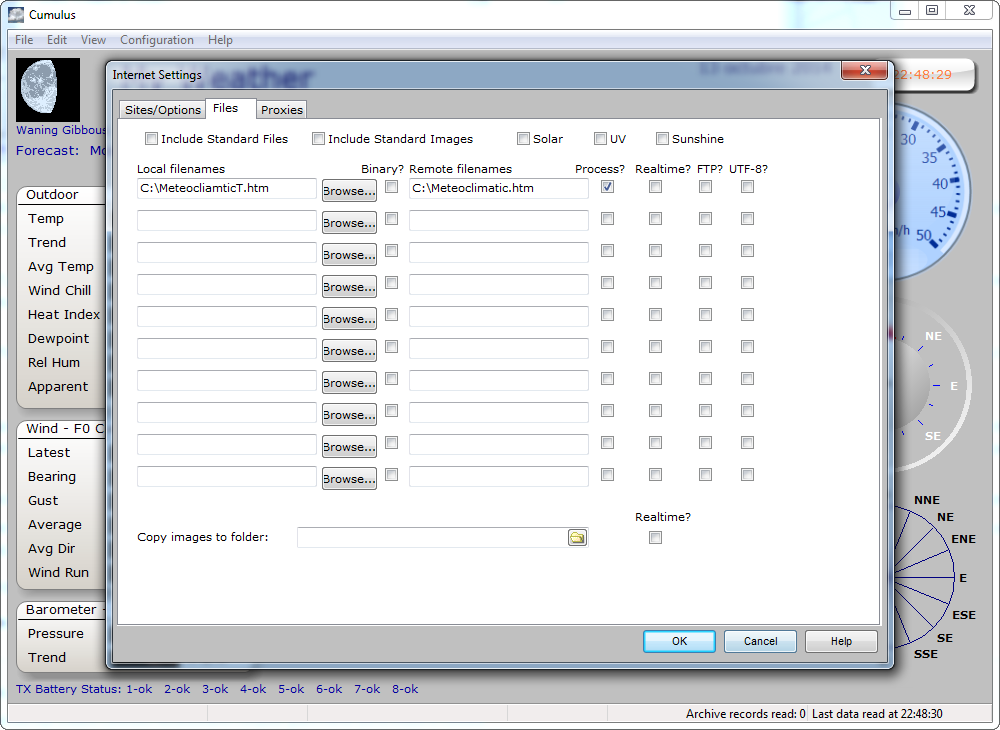 Para ello la configuración de Cumulus cambia ligeramente con respecto al envío por FTP, como podemos ver en la imagen, queda todo igual menos la columna «Remote Filenames», dadoq ue en vez de poner una dirección de un servidor, vamos a poner una dirección de nuestro propio equipo, en este caso yo he escogido poner el archivo generado en «C» por lo que la dirección queda de la siguiente manera «C:\Meteoclimatic.htm».